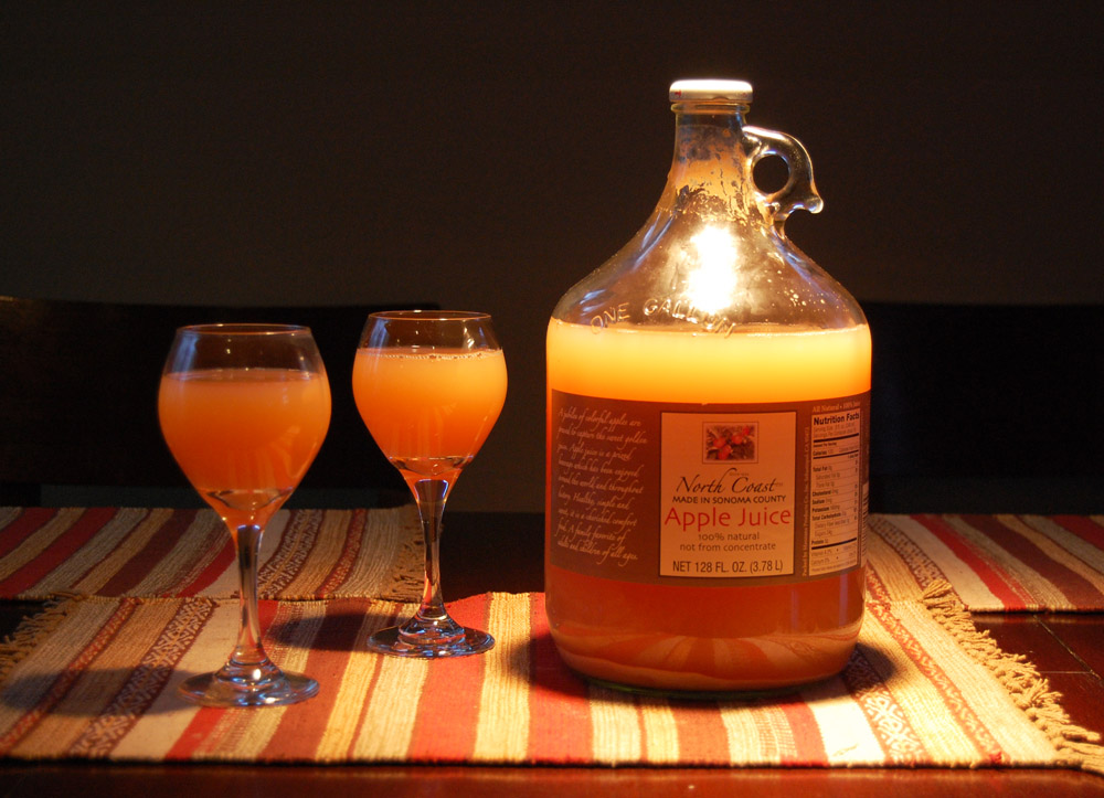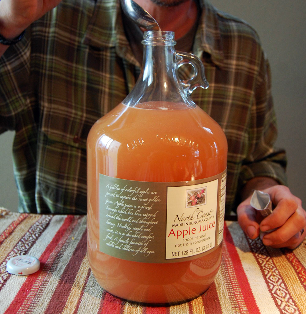 yeastI chose this lovely one-gallon jug bottle of North Coast Sonoma County unfiltered apple juice from the new hipster market in town called Lucky’s. It runs about $5.99 for a bottle this size. The key is to look for something without preservatives, and with a very good natural taste. You can ferment pretty much anything with sugar in it, but we are fancy people here, so we use fancy juice. Apple, grape, mango, pineapple, pear, and berry juices work beautifully.