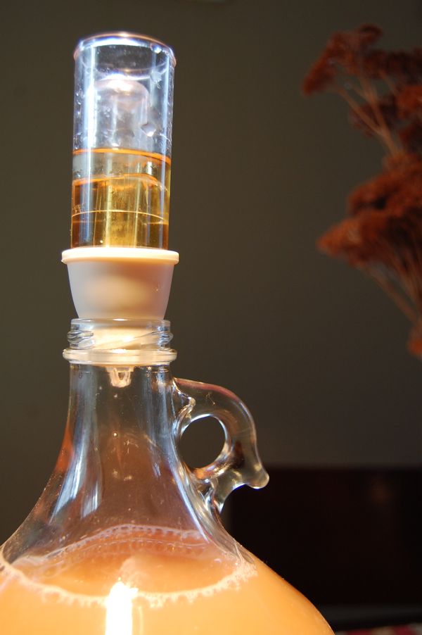 stopperThen put an ounce of clean water (or a sterile liquid like whiskey as shown here) into the airlock. I recommend setting the bottle in the center of your kitchen table at this point so you can watch the show. Within 24 hours, it will start gently bubbling and fizzing, as the yeast works its incredible alchemy of turning the useless sugar molecules into useful alcohol ones. This bubbling will go on for about two weeks. At that point, you may notice that it slows down as the yeast runs low on sugar.